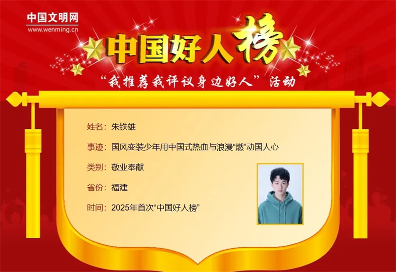 今年6月底,2025年首次“中国好人榜”发布,福建省莆田市湄洲岛自媒体创作者朱铁雄入选。通过短视频传播中华优秀传统文化、挖掘中国式英雄故事,将传统文化与新媒体结合,以创意内容唤起人们对传统文化的热爱,朱铁雄在抖音、微博、B站、小红书、快手等网络平台收获众多粉丝与赞誉,全网粉丝超3600万,被称为“国风青年”。