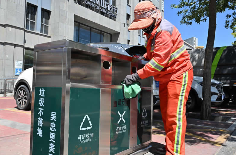 环卫工人擦拭垃圾桶上的灰尘。宁夏文明网供图