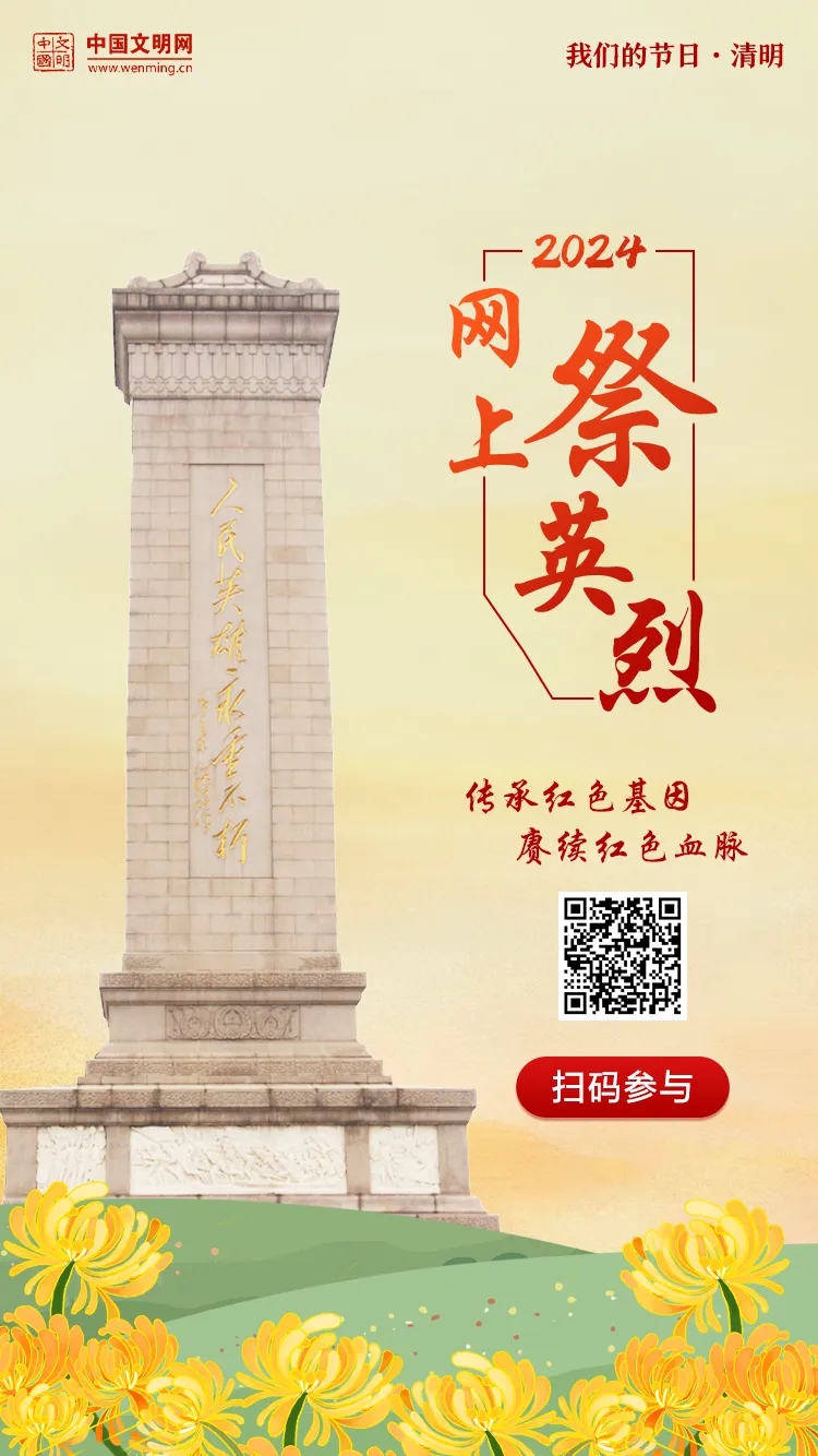 青山埋忠骨,翠柏勉英魂。为缅怀先烈事迹、传承英烈精神,引导广大群众永远铭记为民族独立、人民解放和国家富强、人民幸福作出巨大牺牲和贡献的英雄烈士,在全社会形成赓续红色血脉、汲取奋进力量的良好氛围,清明节期间,中宣部文明实践局、中国文明网联合开展“2024网上祭英烈”网络文明传播活动,扫描图中二维码参与,向英烈表达崇敬、寄托哀思。