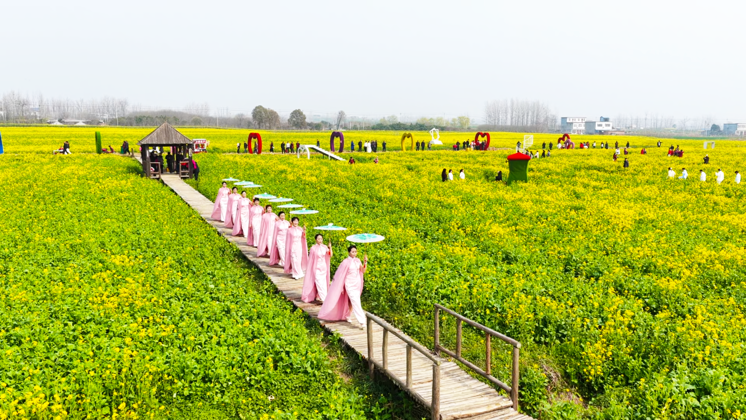 在河南省信阳市平桥区明港镇新集村,千亩油菜田连绵成片,金色花海美不胜收,旗袍走秀与田园风光相映成趣,绘就出景美人和、乡风文明的春日乡村新图景。