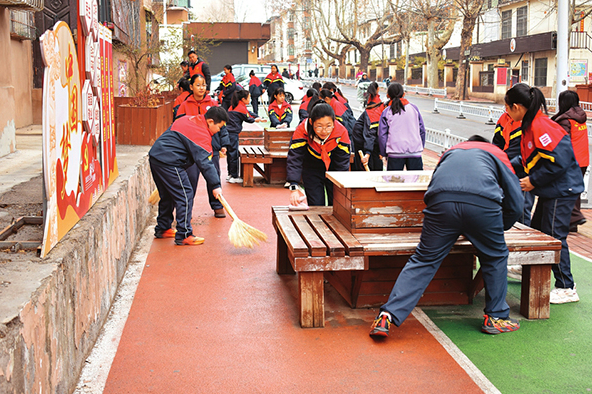 晋城市城区凤台小学雨墨学雷锋志愿服务队的孩子们在社区小游园义务清扫。山西日报记者 王天晓 摄