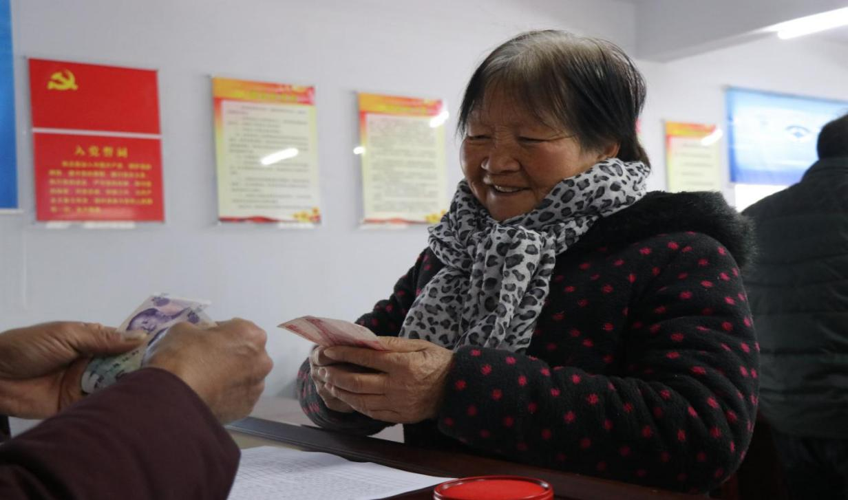 底张乡礼村老人李秀花高兴地领取“孝善基金”。