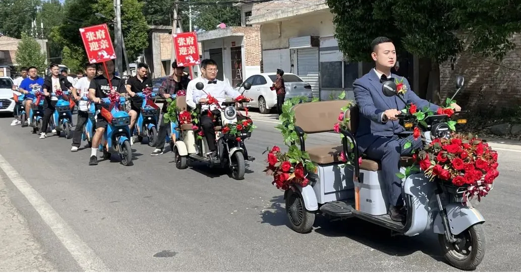 由三轮车和共享单车组成的接亲队伍去迎娶新娘。